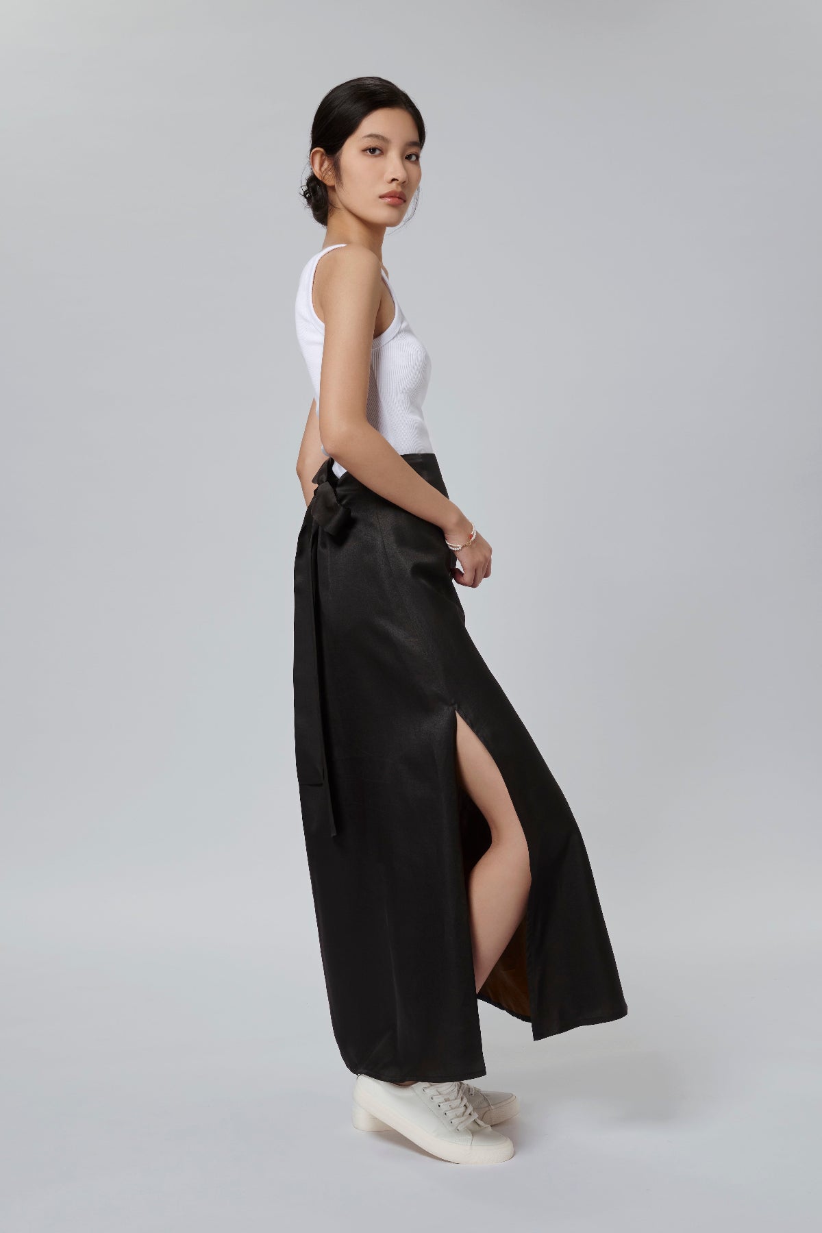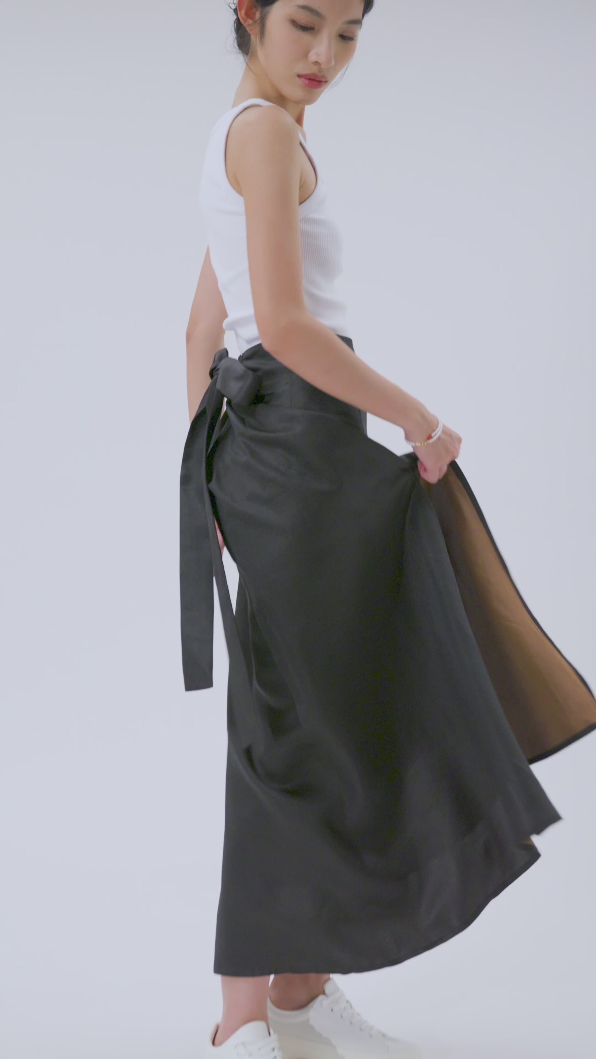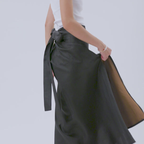 This striking maxi skirt is crafted from black Gambiered Canton Gauze and features a high side slit inspired by the flowing elegance of traditional coeng saam. Its fluid silhouette, paired with a removable self-tie belt and elasticated waistband, effortlessly fuses Eastern heritage with modern ease for versatile styling.