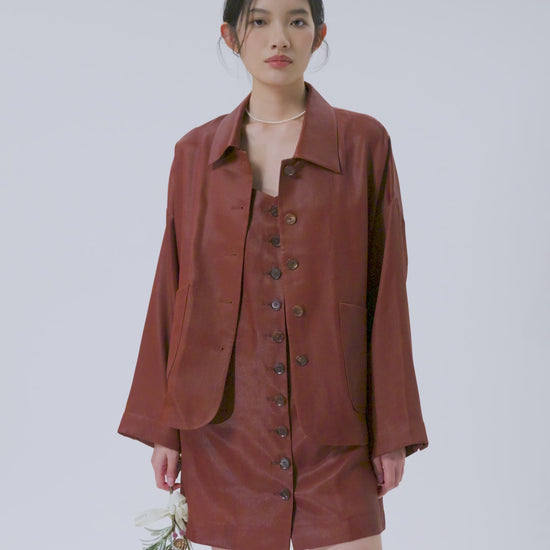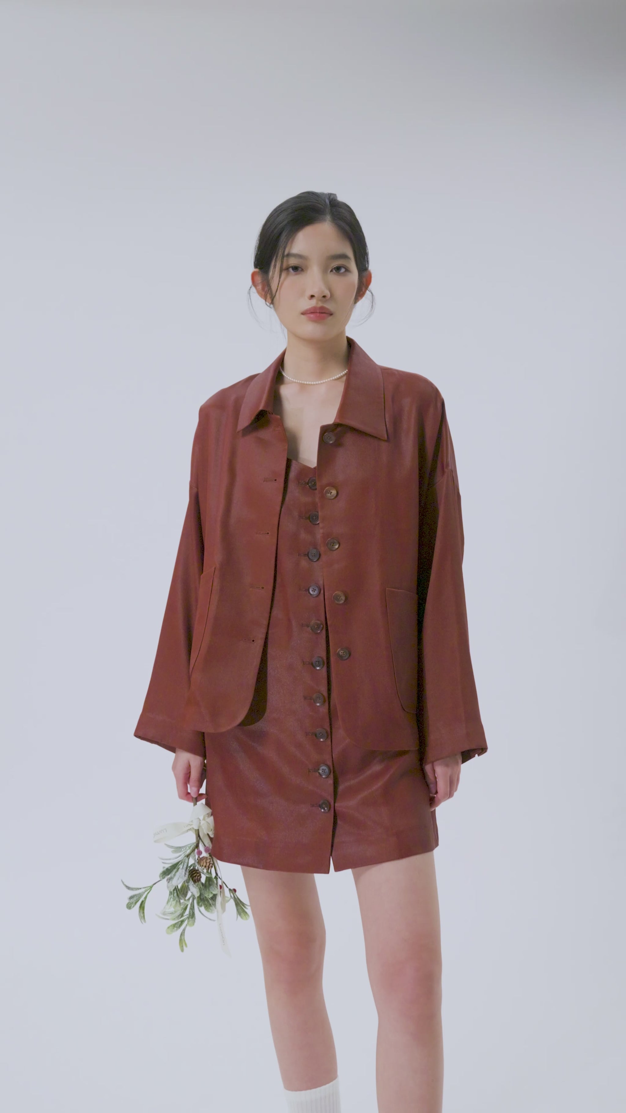 This jacket is expertly crafted from silk with a subtle leather-like texture, combining the sophistication and structure of a leather windbreaker with the breathability and comfort ideal for tropical climates.